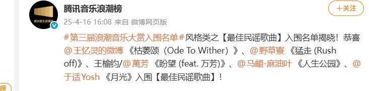 旧年,其原创作品《蟾光》更告捷入围年度最好民谣歌曲提名名单。