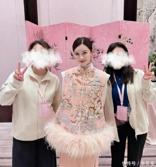 她身穿三件套的新选取投诚,上身是浅粉色打底,外搭同色系带有亮片刺绣的马甲,