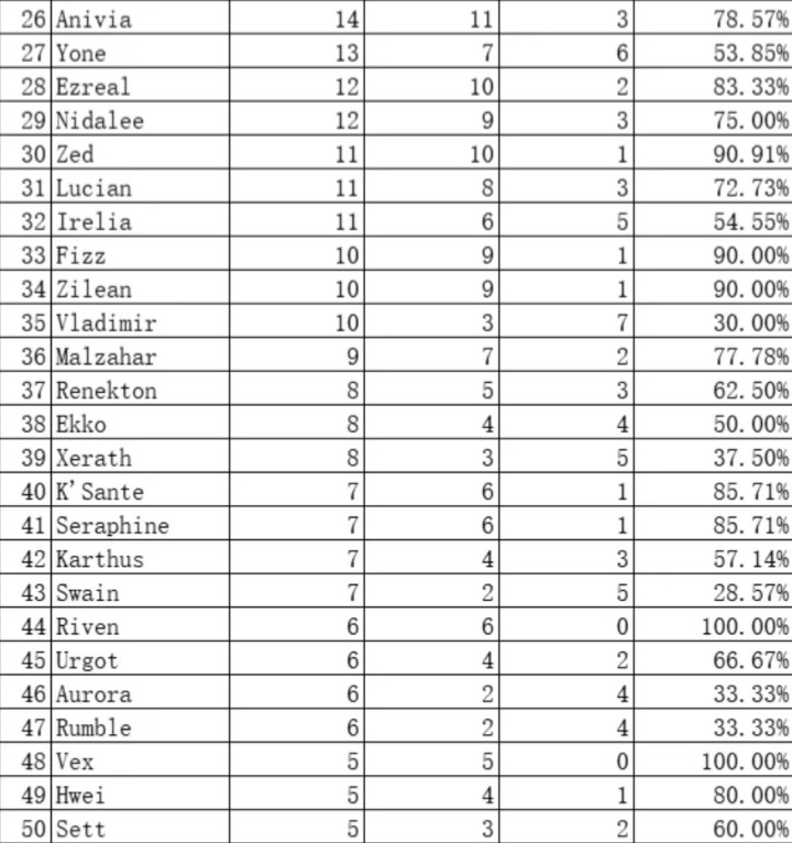 在Faker通盘90个骁雄的数据中,胜率低于50%且登场次数不高的骁雄相称少,这内部只消卡尔玛算是出场次数偏多但胜率较低的骁雄,胜率只消42.31%,其他骁雄基本王人是登场次数10或以下的。