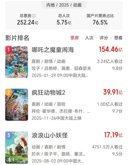 电影也果真不负众望,不雅影东说念主次达4700万、17.19亿票房的获利,令它成为暑期档亚军,突破中国影史二维动画电影票房记录,并位列中国影史动画电影票房TOP6。精深不雅众在影院为其感动落泪,近60万影迷在豆瓣上为其打出了8.5的高分,该片还与《哪吒之魔童闹海》《猖獗动物城2》等动画电影一同孝敬了2025年近半数票房。