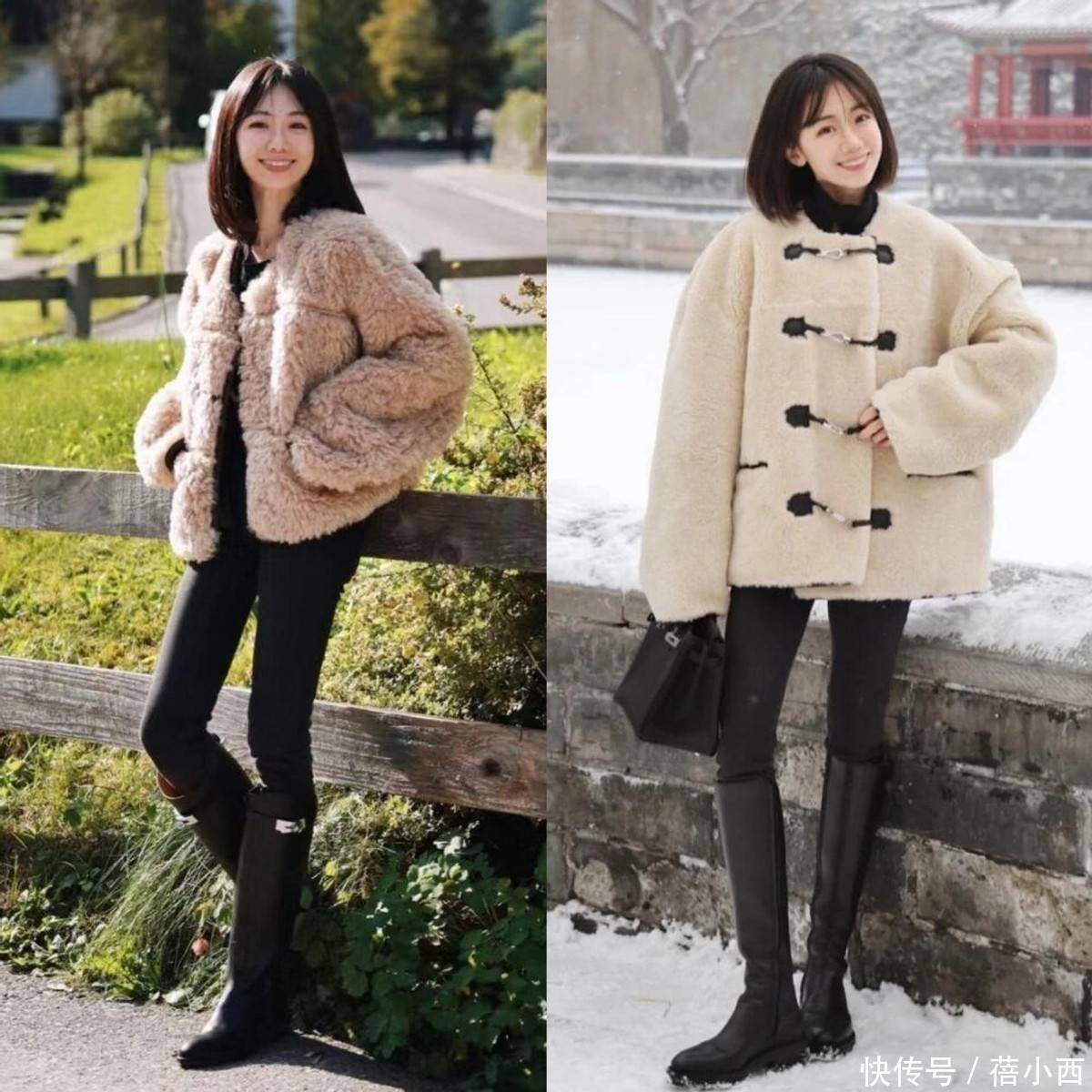 宝子们,这两套毛绒短外衣是小个子穿搭的显高御寒模板!短款衣长卡在臀部,搭配高腰紧身裤 + 长靴,上宽下紧藏肉又利落。