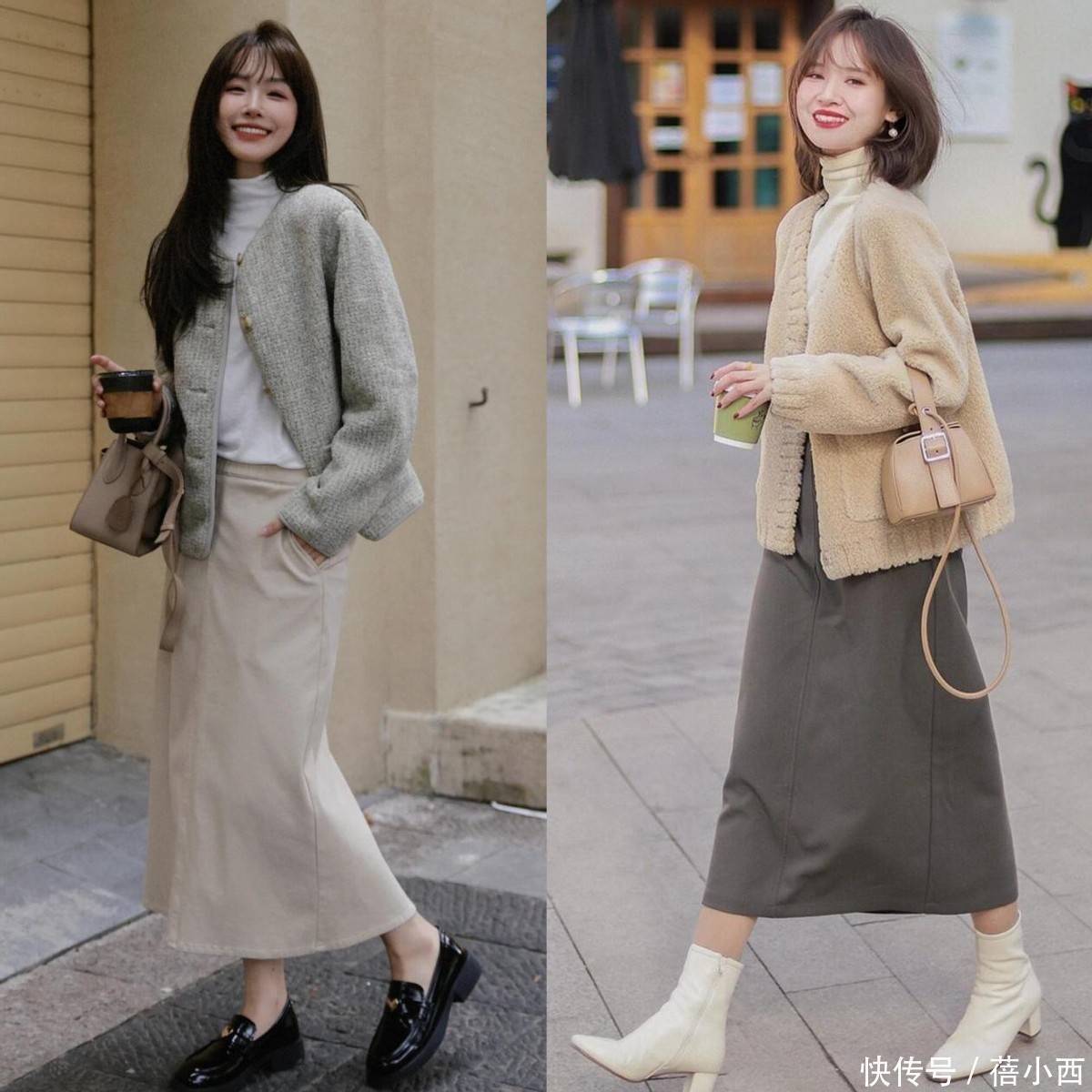 左边灰真挚 + 米色裙,配乐福鞋利落通勤;右边羊羔毛 + 深灰裙,搭白靴柔和减龄,低饱胀配色自带高等穿搭质感,黑 / 白鞋与裙装的同色呼应,更强化了显瘦穿搭后果,小个子这样穿,大肆拿捏柔和文静感!
