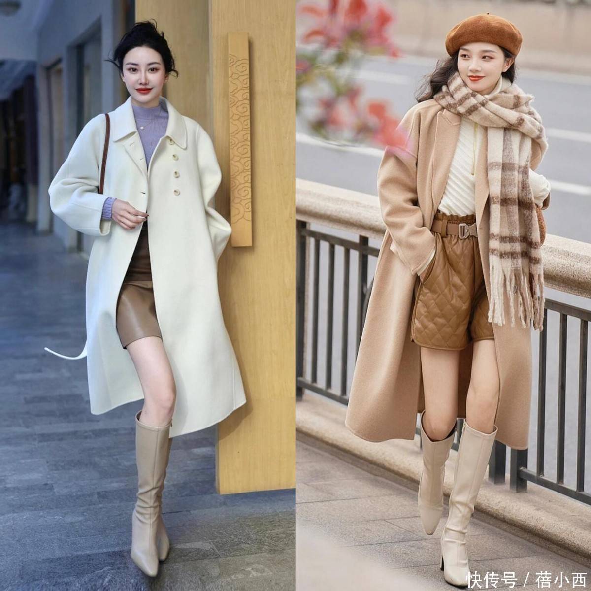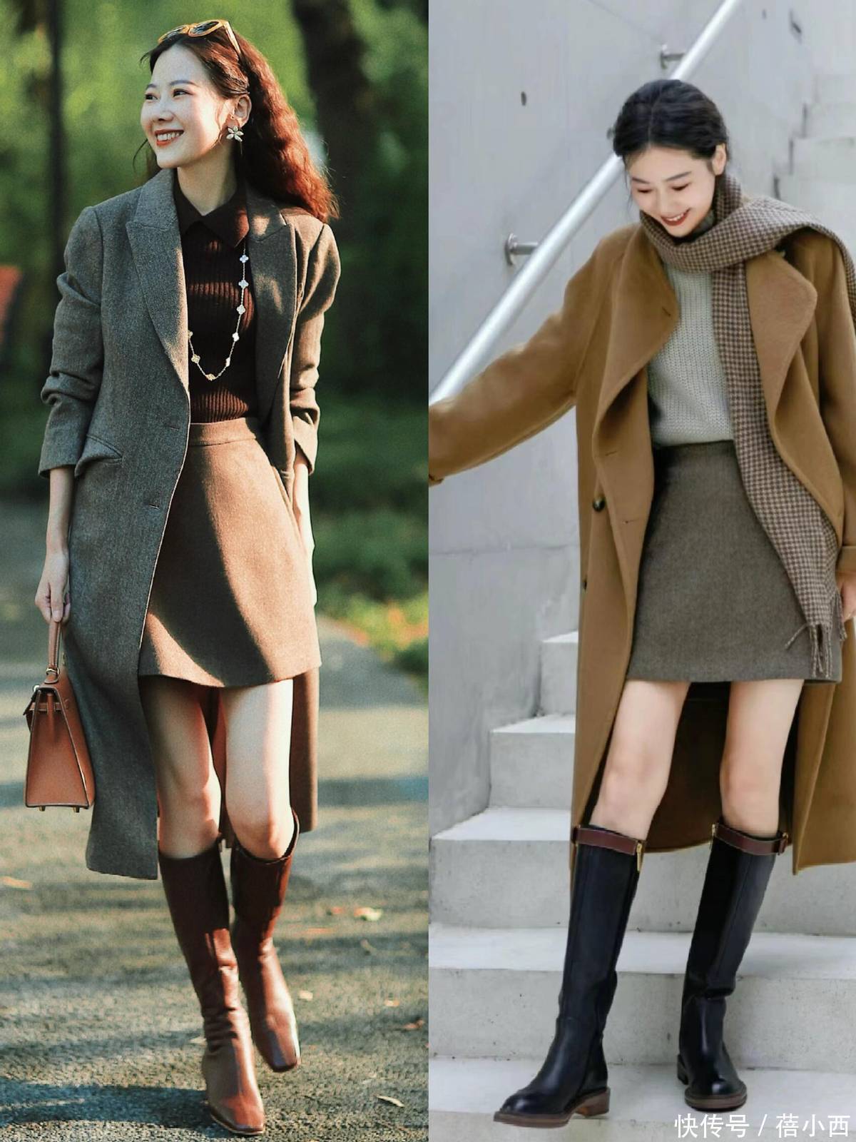 露肤显高:选膝上短裙 + 光腿 / 薄丝袜,清楚腿部线条,搭配同色系长靴,从裙边到鞋身无断点,是小个子穿搭的显高中枢。