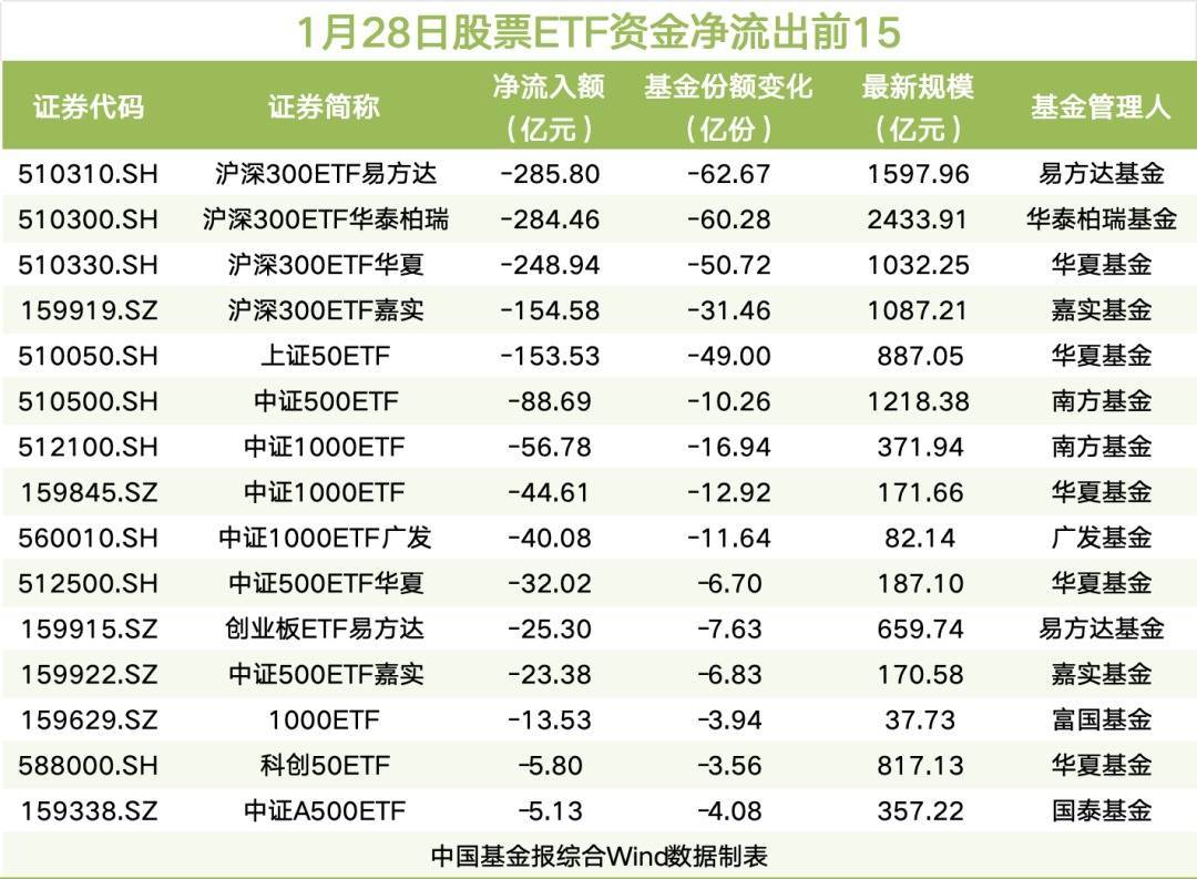 1月28日开云「中国」kaiyun体育网页 登录入口,A股三大指数涨跌不一。股票ETF市集上,资金延续净流出态势,当日净流出超1300亿元。