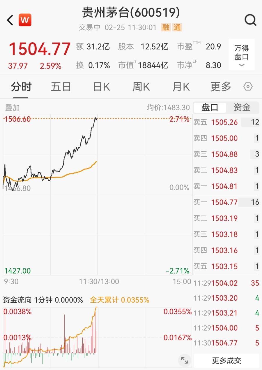 罢休午间收盘,贵州茅台报1504.77元/股,涨2.59%,总市值为1.88万亿元。